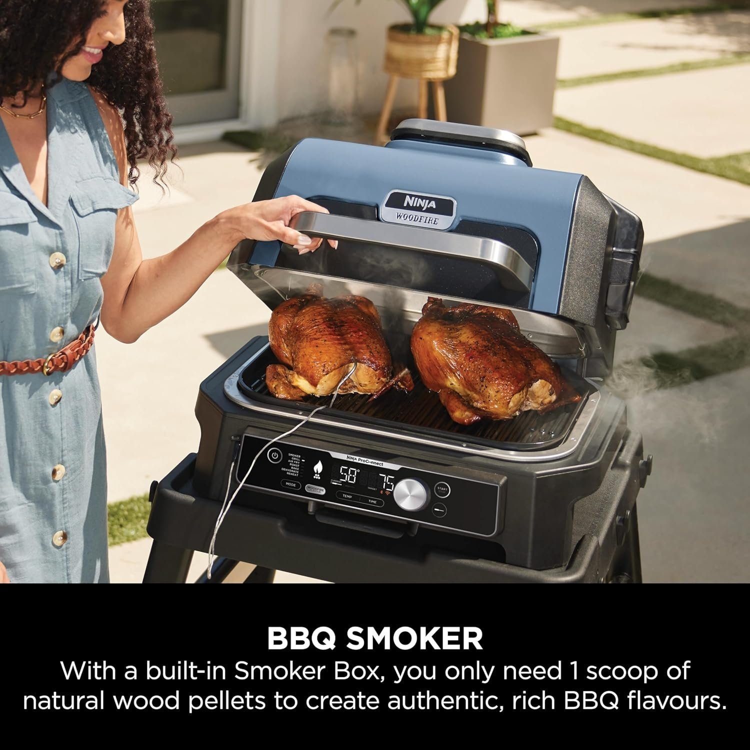 Ninja OG901UK Woodfire Pro Connect XL elektrische grill en roker ontworpen voor ultieme buitenkookervaring met combinatie van moderne technologie en traditionele houtvuuraroma, levert krachtige prestaties met constante temperatuurregeling en geavanceerde functies die iedere maaltijd naar hoger niveau tillen, beschikt over royale kookruimte waardoor grote porties tegelijk bereid kunnen worden zonder concessie aan smaak of textuur, ideaal voor familiefeesten, barbecues en lange zomeravonden, combineert elektrisch gebruiksgemak met authentieke rookaroma afkomstig van echte houtpellets, garandeert diepe smaakontwikkeling bij vlees, vis, groenten en gevogelte, biedt veelzijdige kookopties zoals grillen, roken, bakken, braden en langzaam garen waardoor flexibiliteit en creativiteit in buitenkeuken grenzeloos worden, voorzien van slimme connectiviteit via mobiele app zodat bediening, monitoring en receptsuggesties altijd binnen handbereik zijn, robuuste constructie en hoogwaardige afwerking zorgen voor duurzaamheid en betrouwbare prestaties jaar na jaar, compacte en toch ruime vormgeving maakt apparaat geschikt voor balkon, tuin of terras, eenvoudig te reinigen onderdelen en slimme luchtcirculatie zorgen voor hygiënisch gebruik zonder gedoe, krachtige warmte-elementen garanderen snelle opwarming en gelijkmatige verdeling van hitte over volledige grillplaat, extra grote capaciteit maakt gelijktijdig bereiden van meerdere gerechten mogelijk zodat iedereen tegelijkertijd kan genieten van warme, smaakvolle creaties, innovatieve Woodfire-technologie zorgt voor intense rookaroma zonder gebruik van kolen of gas waardoor koken eenvoudiger, schoner en milieuvriendelijker verloopt, ideaal voor enthousiaste thuiskoks die professionele resultaten willen bereiken zonder ingewikkelde installaties of constante controle, energiezuinig ontwerp vermindert onnodig verbruik terwijl prestaties altijd op hoog niveau blijven, veelzijdige accessoires en mogelijkheden maken experimenteren met verschillende kookstijlen aantrekkelijk en inspirerend, van sappige steaks en knapperige groenten tot langzaam gegaarde ribben met volle rooksmaak, elke bereiding krijgt unieke signatuur van houtgestookt aroma gecombineerd met precisie van elektrisch koken, perfect hulpmiddel voor wie gemak, innovatie en culinaire vrijheid wil samenbrengen in dagelijkse keukenmomenten, ontworpen om kookplezier, sociale gezelligheid en hoogwaardige smaakbeleving te combineren in ieder seizoen, betrouwbaar, krachtig en stijlvol centrum van buitenkeukenervaring.